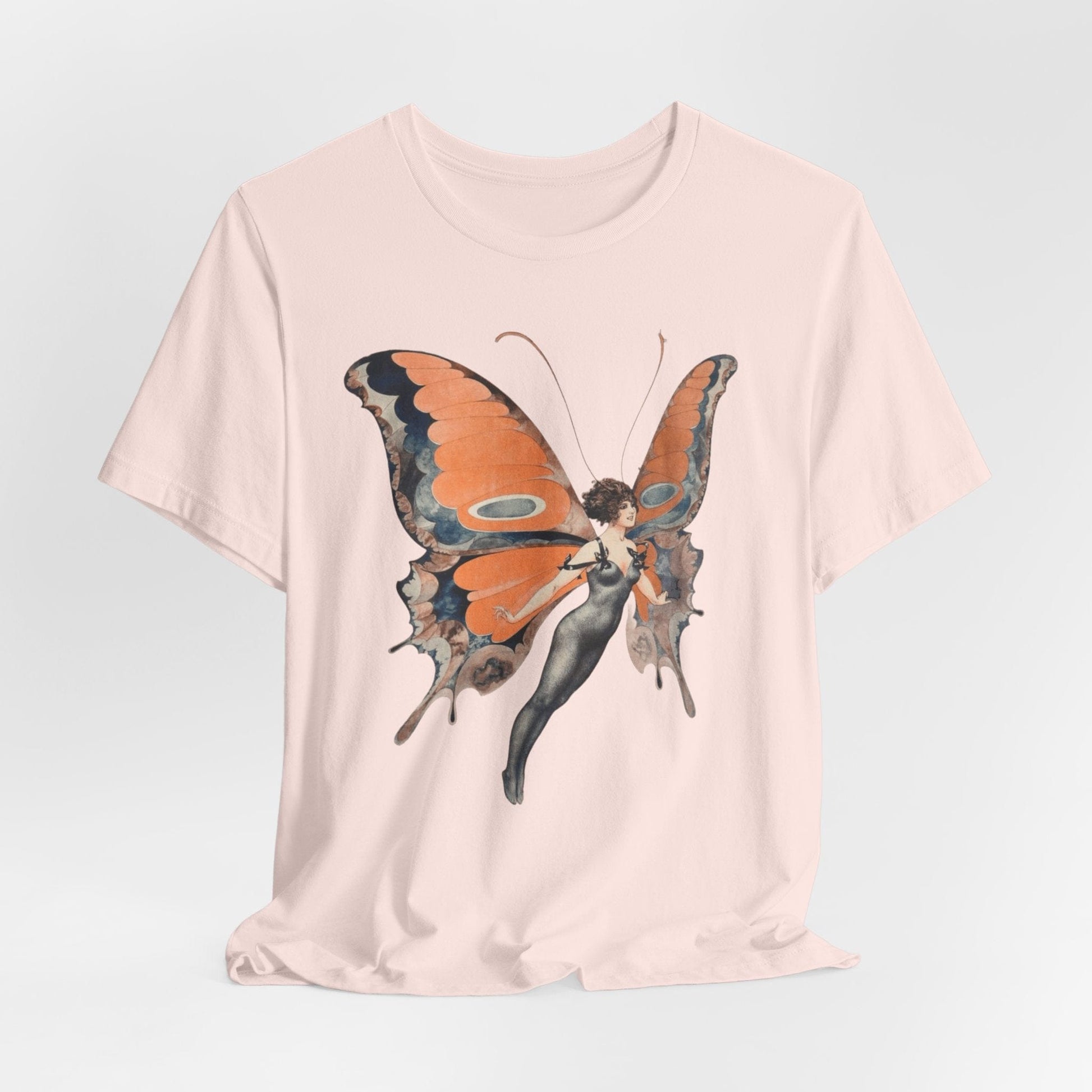 Step into the ethereal beauty of the Art Nouveau era with this vintage-style illustration featuring a graceful woman with striking butterfly wings. Rendered in soft shades of burnt orange, navy, and taupe, her elegant pose and detailed wings evoke fantasy, femininity, and timeless charm. Perfect for vintage lovers, fairycore enthusiasts, or anyone drawn to whimsical, cottagecore aesthetics.