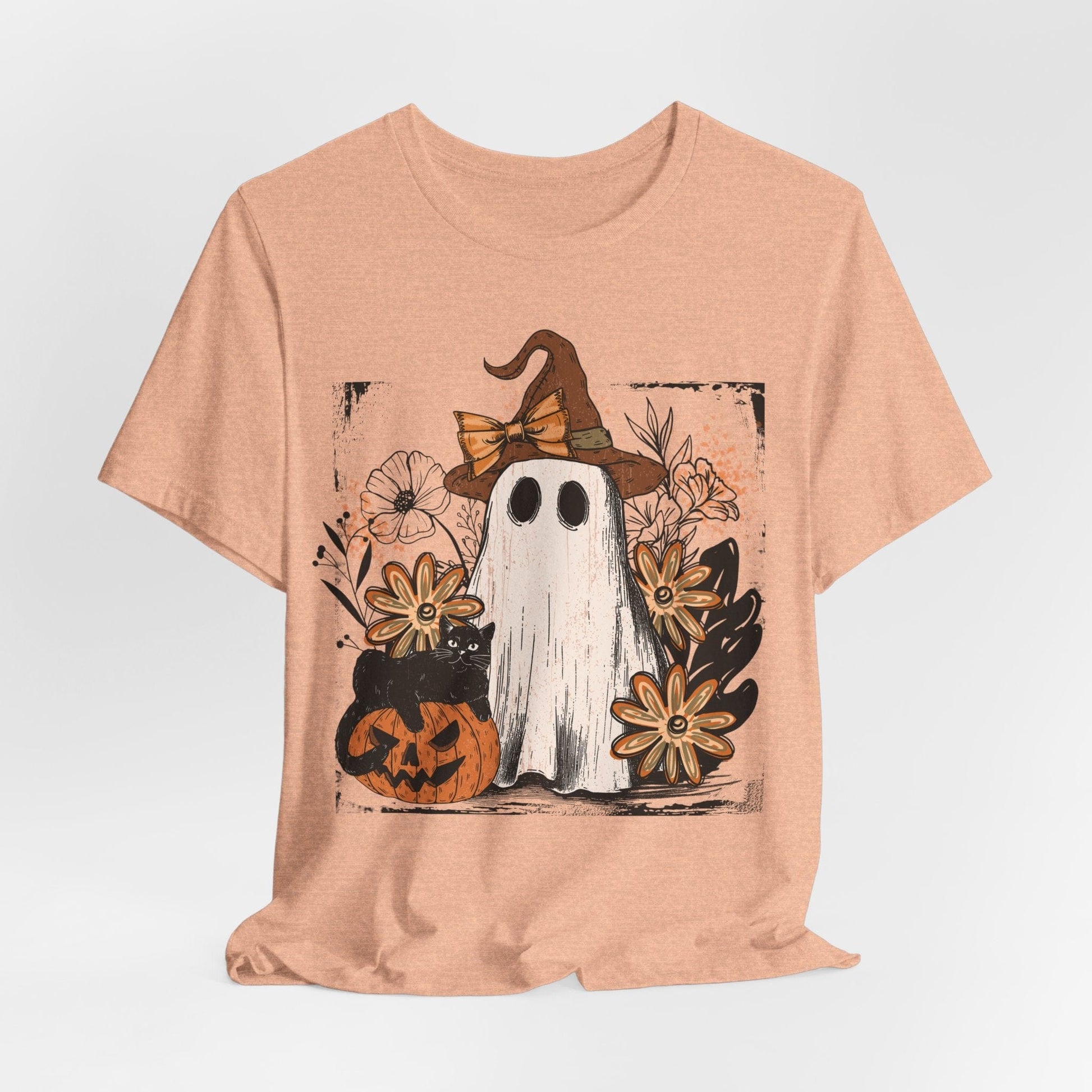 Softly spooky and hauntingly cute, this Halloween tee blends autumn charm with gothic flair. Featuring a ghost in a witch hat surrounded by retro daisies, a grinning jack-o’-lantern, and a mischievous black cat, it’s the perfect mix of spooky and sweet. Great for fall festivals, pumpkin patches, or cozy October nights.