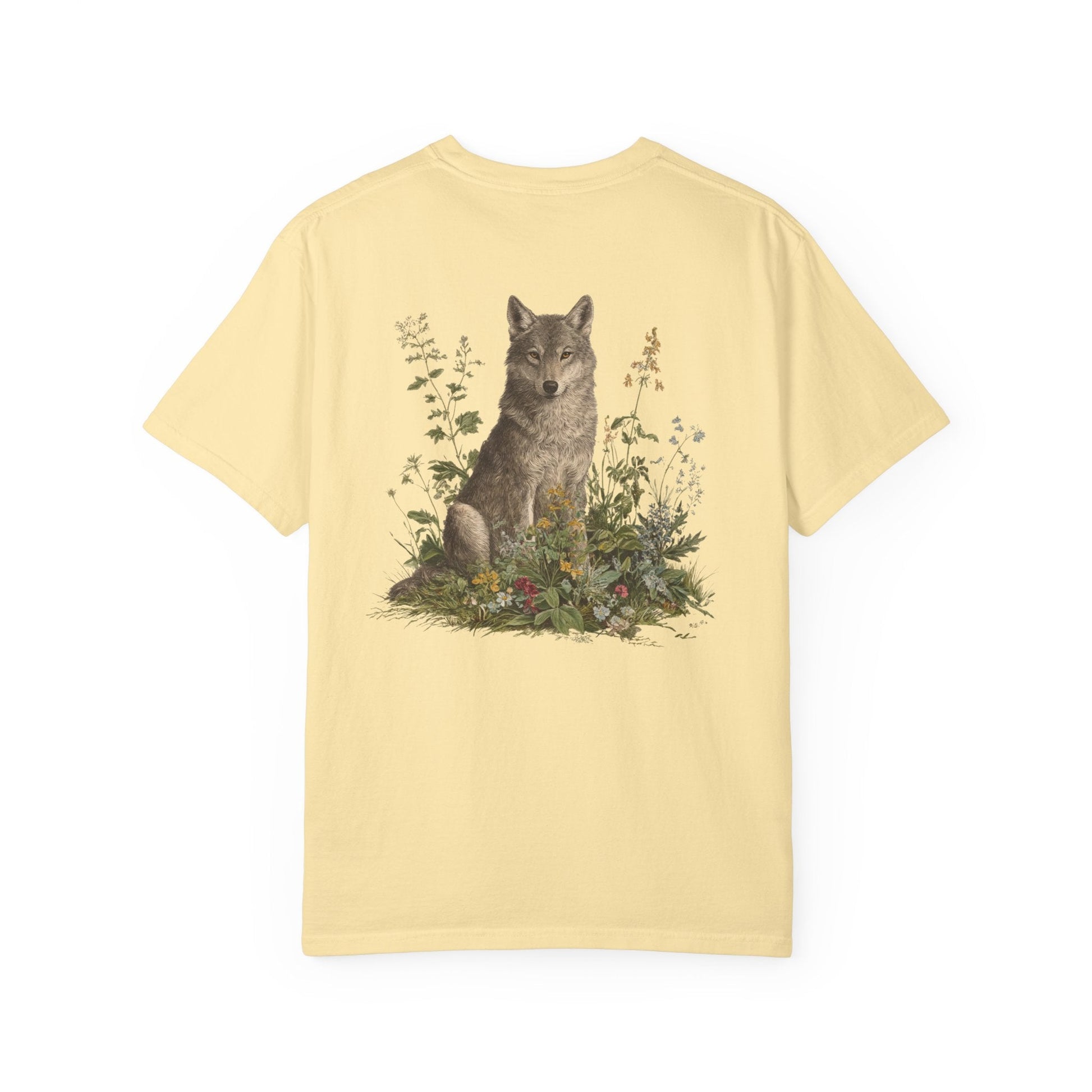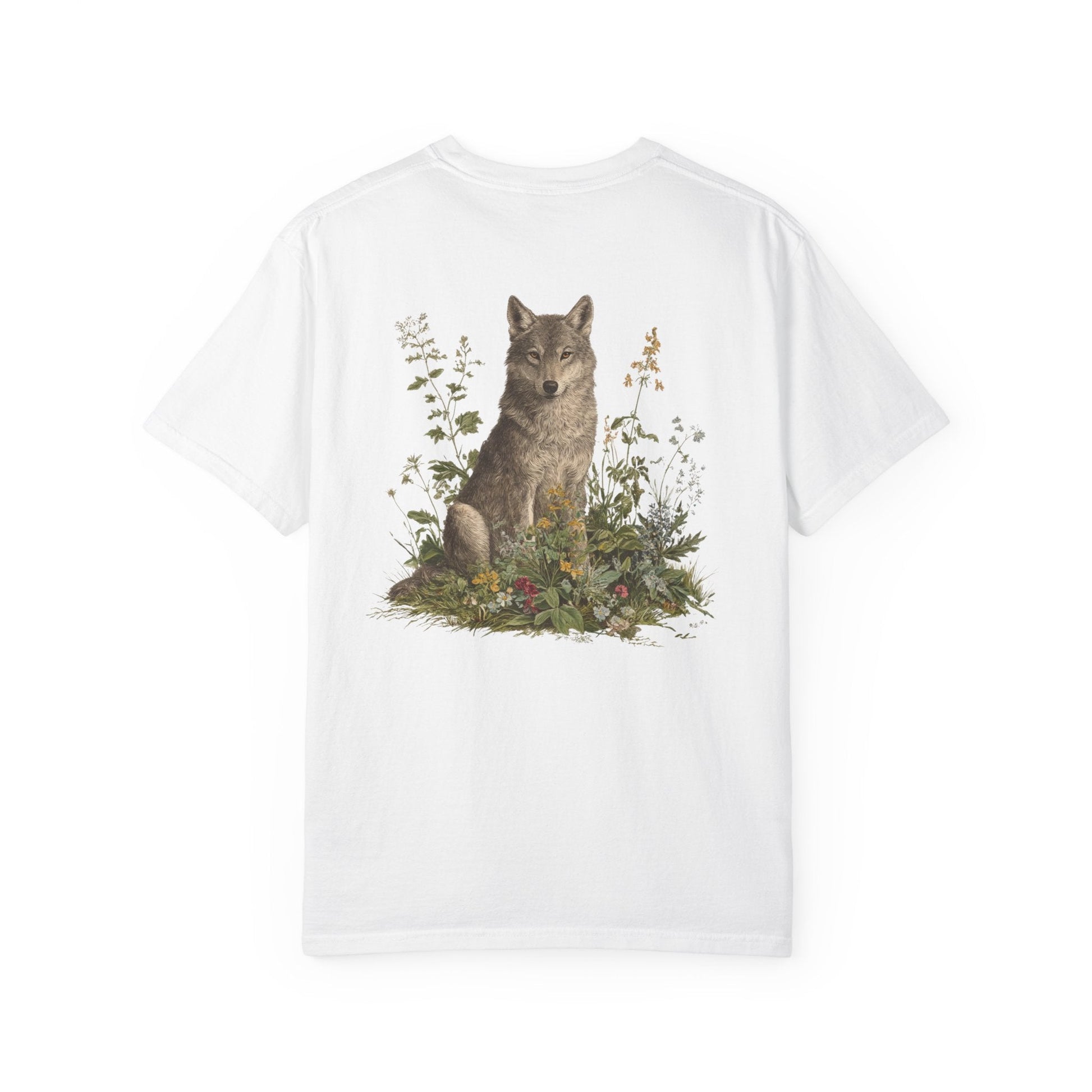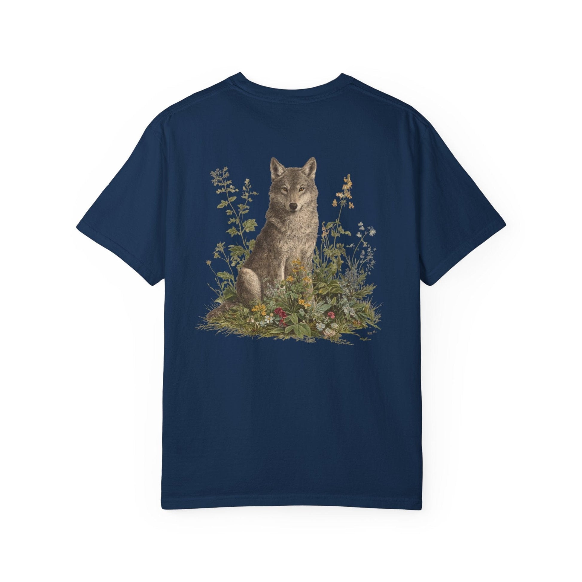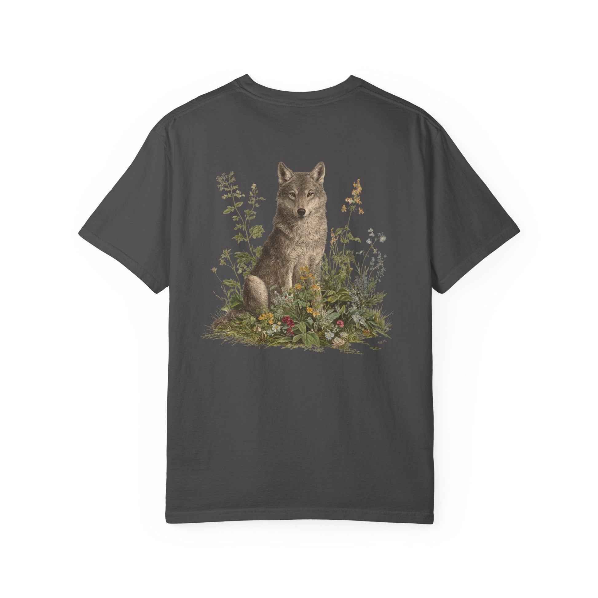 A grey wolf stands watch among blooming meadows in this vintage-style tee. Symbol of instinct, protection, and soulful independence — perfect for anyone who listens to the call of the wild and the whisper of the flowers.