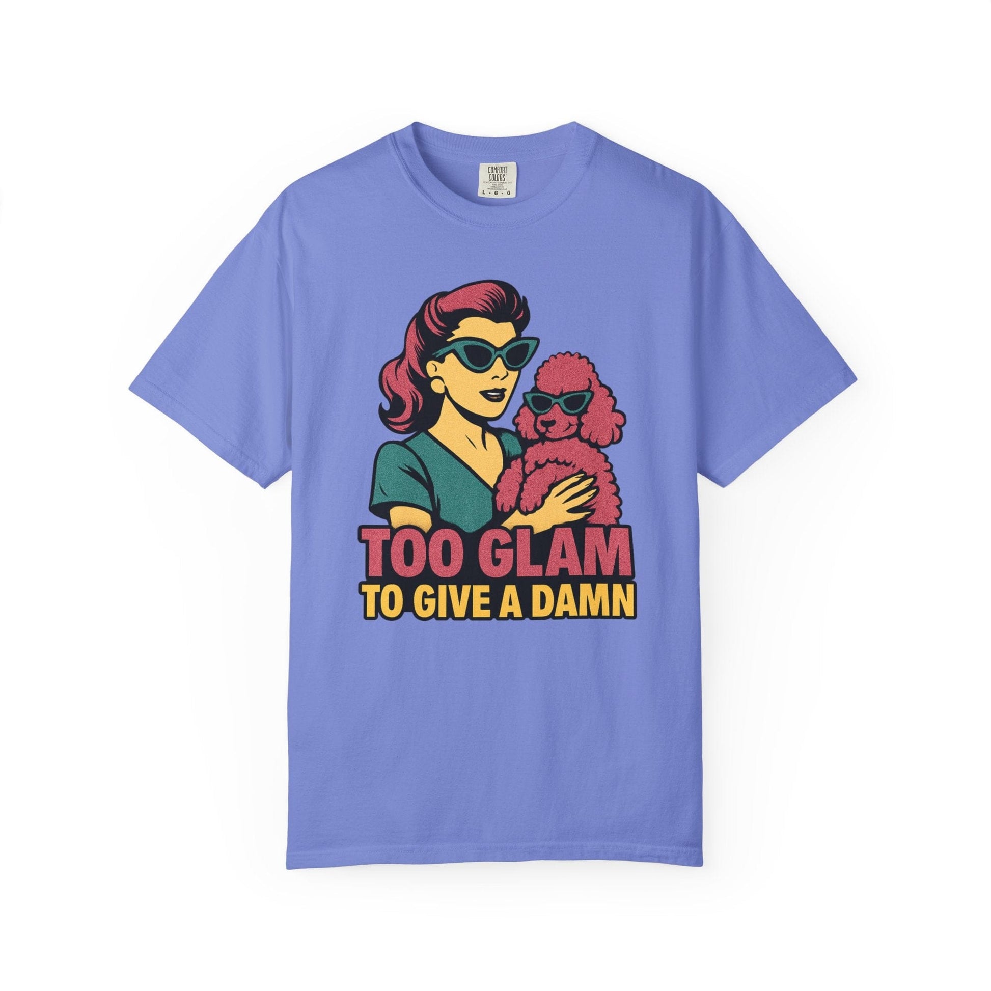 Turn heads and spread sass with this bold retro-style tee featuring a glamorous woman and her stylish poodle rocking matching sunglasses. The playful "Too Glam to Give a Damn" slogan makes it the perfect statement piece for anyone with confidence, humor, and a love for vintage vibes. Soft, comfortable, and perfect for casual outings or gifting to your most fabulous friends.