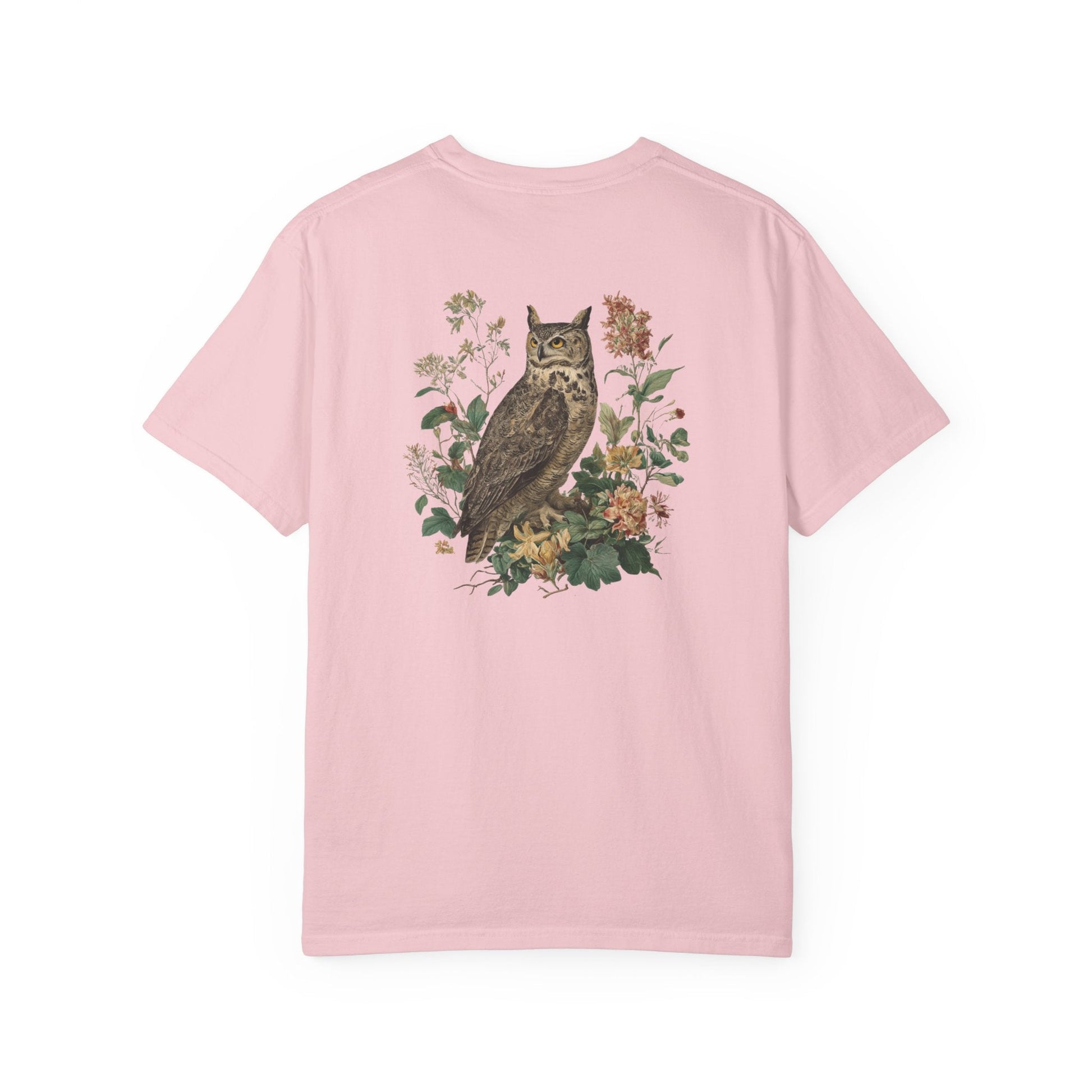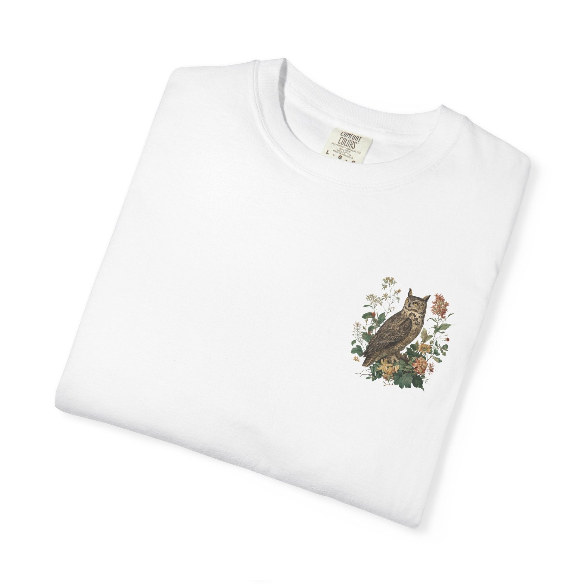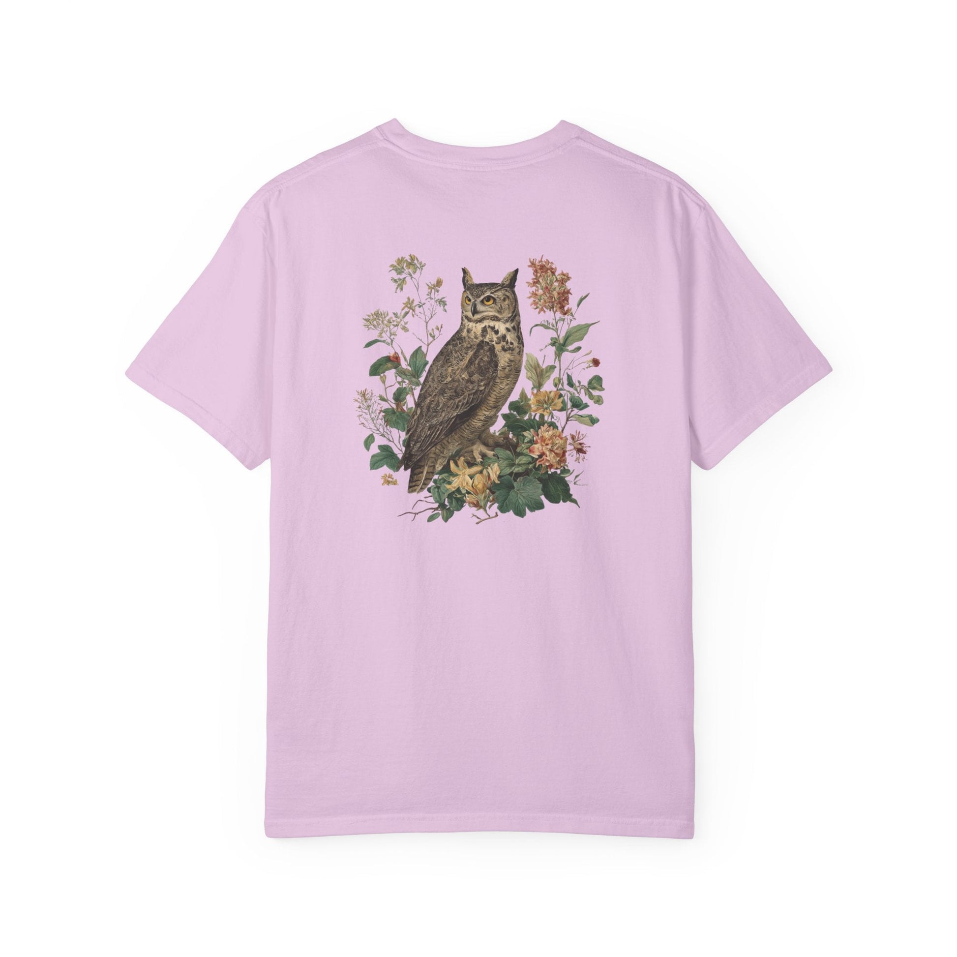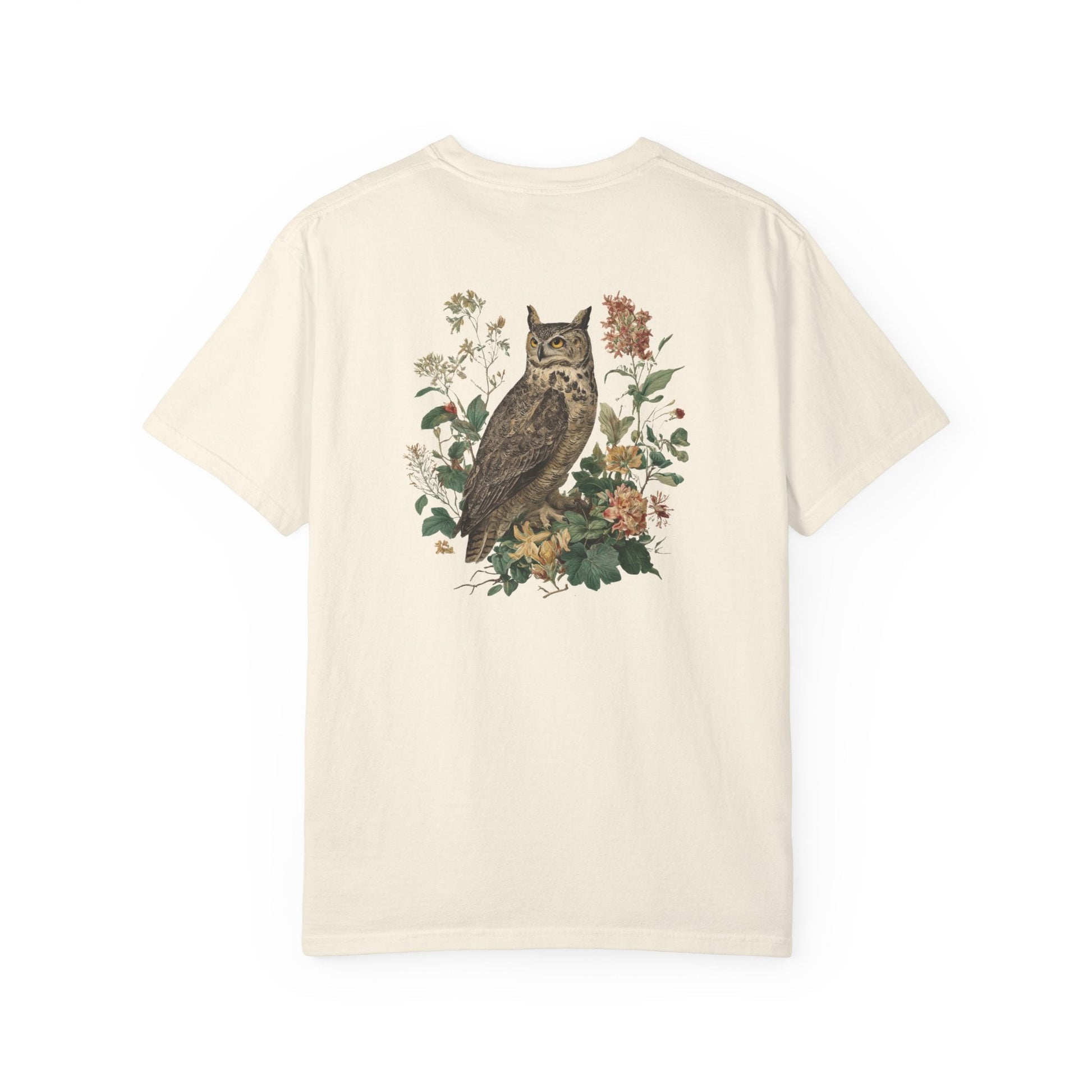 Elegant and mysterious, the horned owl sits calmly in a bed of wild blooms in this vintage-inspired design. A perfect tee for anyone drawn to symbols of knowledge, reflection, and quiet wisdom.