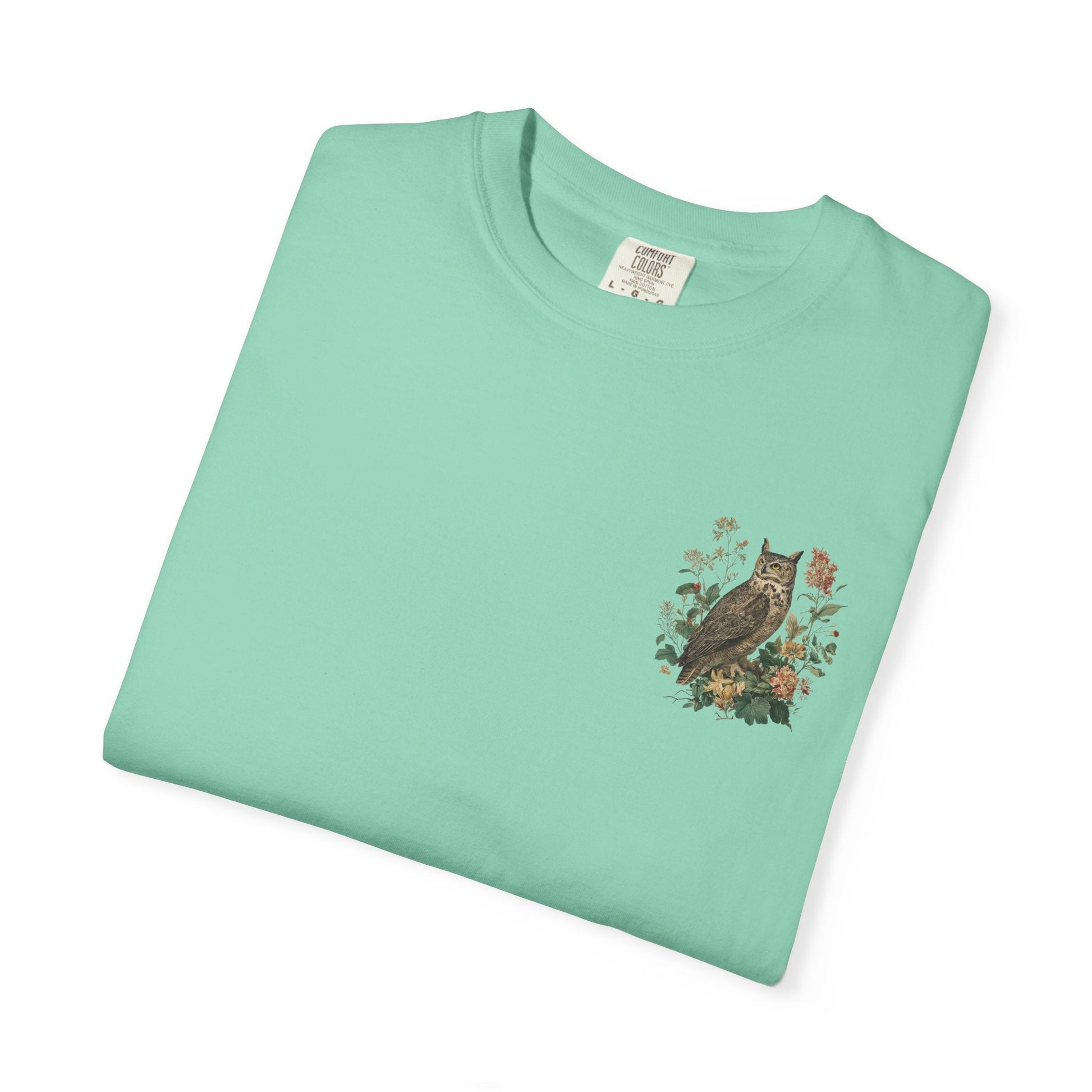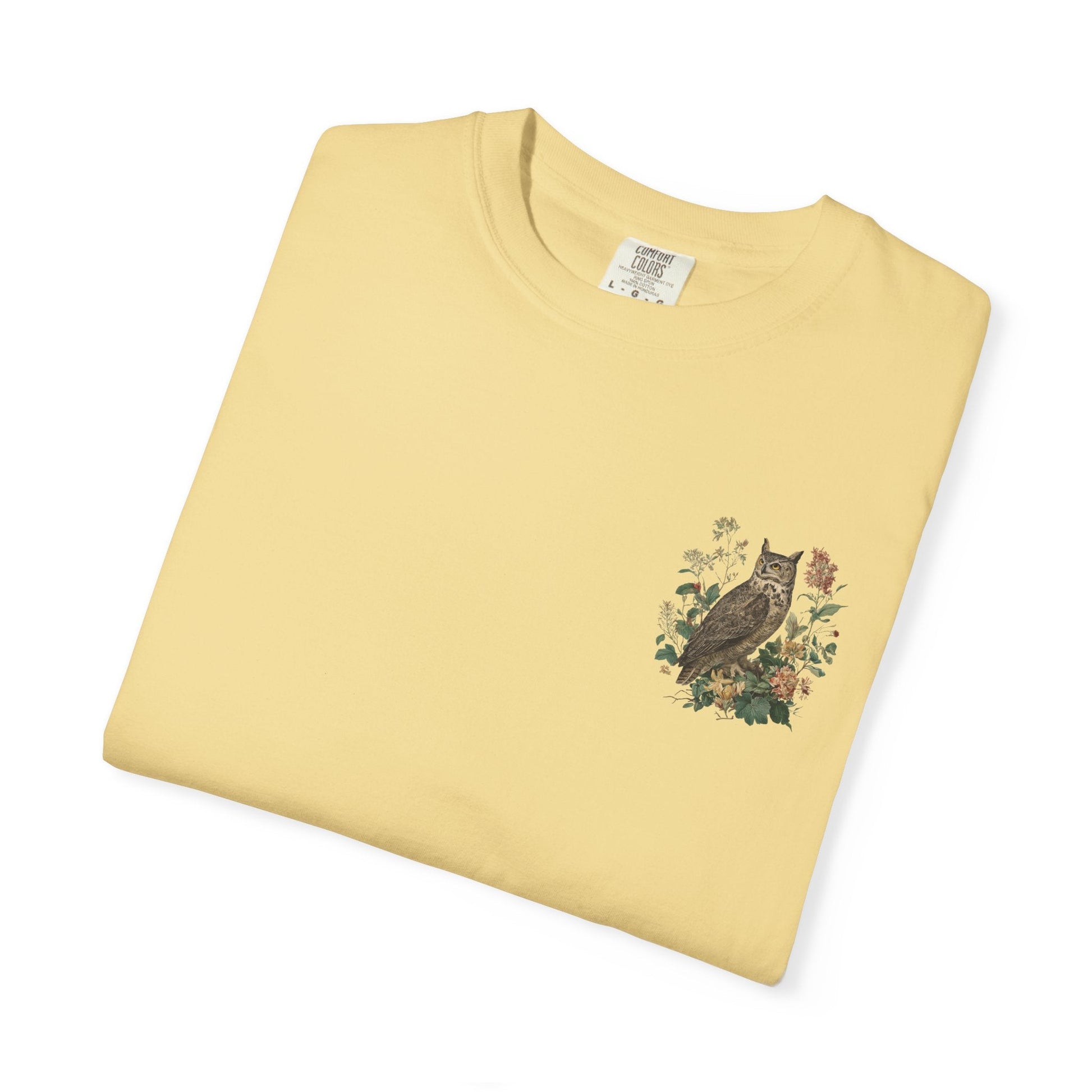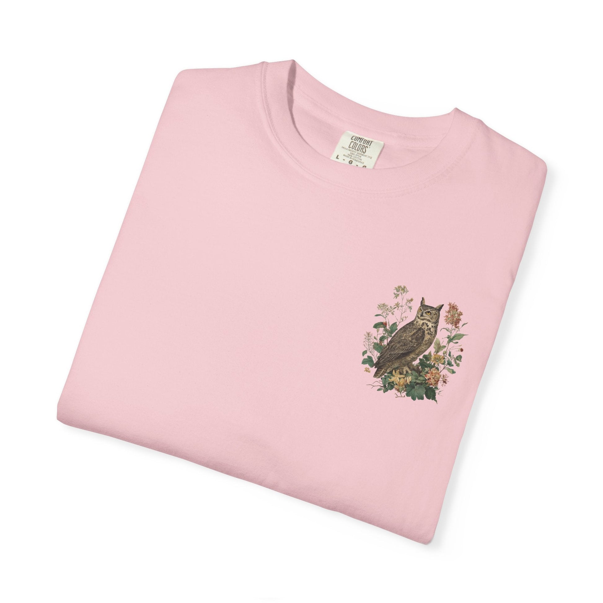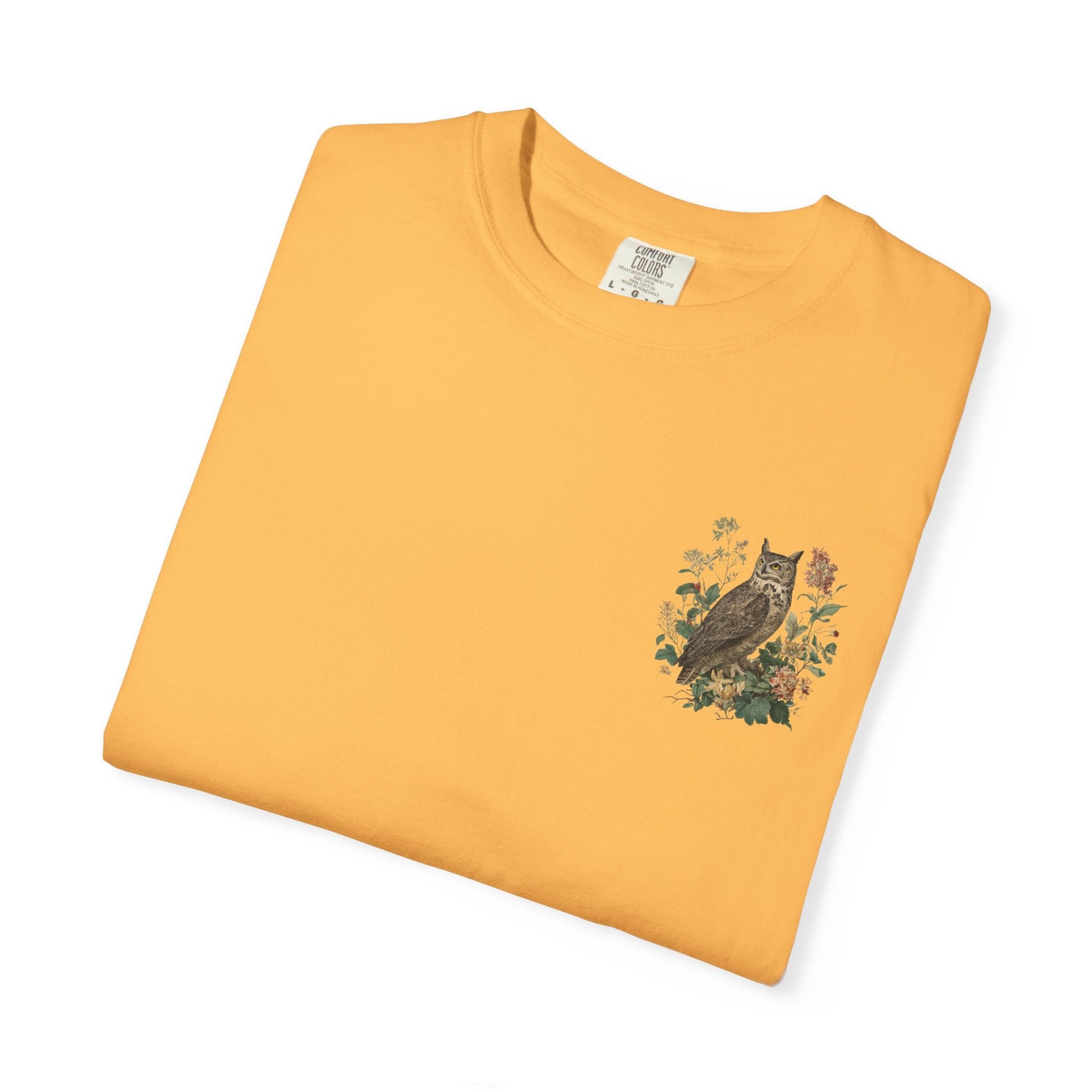 Elegant and mysterious, the horned owl sits calmly in a bed of wild blooms in this vintage-inspired design. A perfect tee for anyone drawn to symbols of knowledge, reflection, and quiet wisdom.
